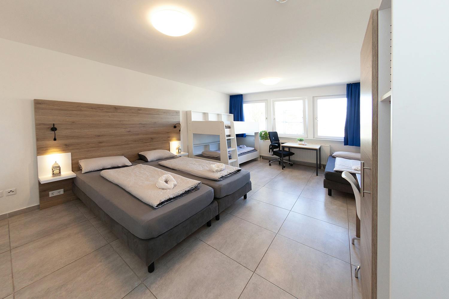 Unser Fünfbettzimmer im Oyten Hostel ist eine großartige Option für größere Gruppen oder Familien, die gemeinsam reisen. In diesem geräumigen Zimmer finden Sie fünf bequeme Betten, die ausreichend Platz bieten, um sich auszuruhen und zu entspannen. Das Zimmer ist mit WLAN und einem Fernseher ausgestattet, um Ihren Aufenthalt so angenehm wie möglich zu gestalten. Ob Sie nach einem erlebnisreichen Tag in Oyten zur Ruhe kommen oder Ihre Pläne für den nächsten Tag schmieden möchten, dieses Fünfbettzimmer bietet Ihnen die perfekte Unterkunft. Genießen Sie den Komfort und die Annehmlichkeiten, die wir bieten.